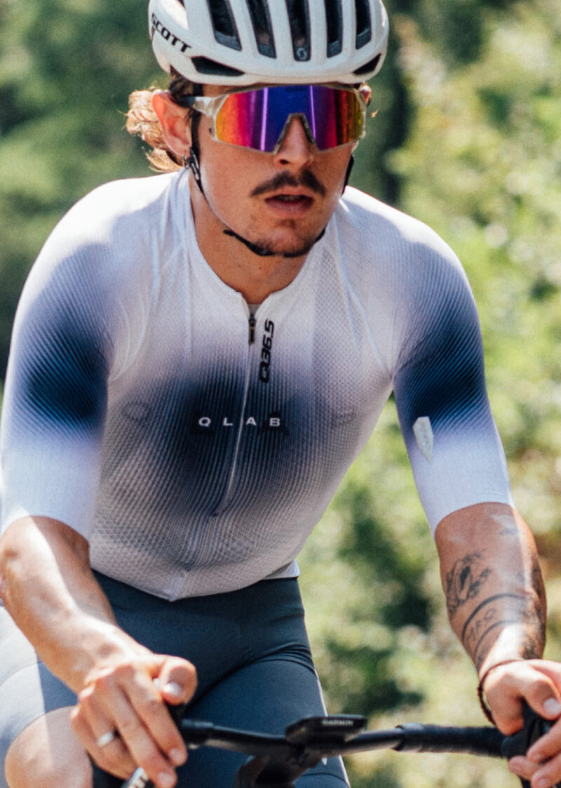 Confeccionado con tejido de malla patentado, el maillot Q36.5 Gregarius Clima QLAB crea una estructura 3D casi imperceptible en el torso para mejorar la ventilación y la transferencia de humedad. Ligero y suave al tacto, la trama de malla en panel de abeja, utilizado en los paneles traseros, favorece un efecto push-pull que evita la acumulación de humedad. El diseño raglán de las mangas usa el mismo tejido aerodinámico acanalado que nuestro maillot Gregarius Pro. La sensación de ligereza se refuerza por los bolsillos traseros de malla, exclusivos de este modelo.